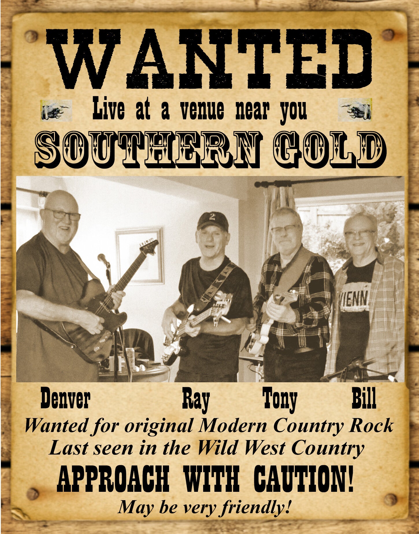 More recently Tony answered an ad in a local paper and found Bill, an enjoyable partnership had started. Ray, who is an excellent bass player that Tony had played with in bands before, joined shortly after and we began exploring the songs we’d like to add to our repertoire. Tony introduced one of his songs and was surprised and encouraged when they requested more of the same. He was pleased to be able to dust off some of the many songs that he's penned, recorded and produced at home over the years, and do something he never believed he’d do; start playing his original songs with a band. We felt it was time to bring in a fourth member of the band, Denver joined us and Southern Gold was born. He's now found some excellent like-minded musicians who are happy to share his vision. The band is presently preparing to launch itself onto the West Country scene.